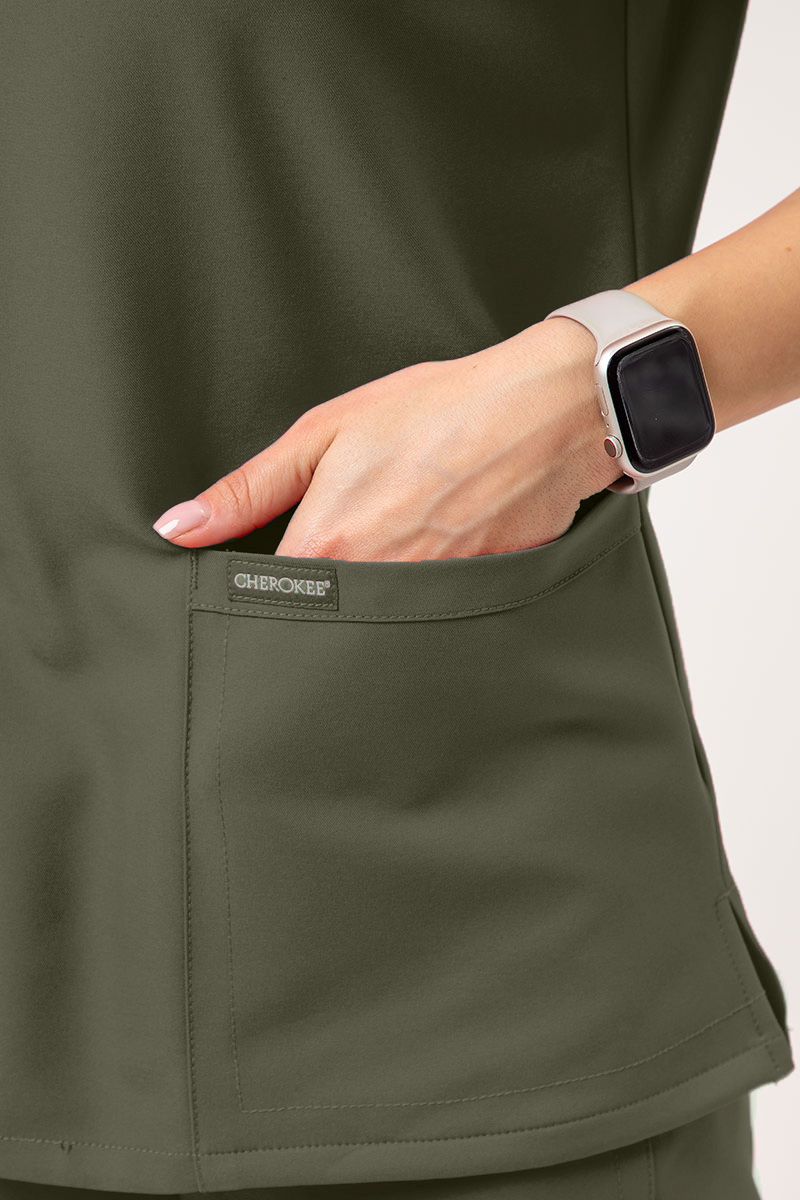 Dlouhodobé pohodlí - je to to, na co myslíte především při výběru oblečení do práce? Tato halena z kolekce Cherokee Originals Ultra vám zajistí nejen pohodlí na celý den, ale také profesionální a módní vzhled. Potěší vás její klasický střih s krátkými rukávy a úzkým střihem s výstřihem do V, který se na spodním okraji rozšiřuje, aby vám poskytl maximální volnost. Tkanina topu je prodyšná, rychleschnoucí, odolná proti vyblednutí a pomačkání, snadno se udržuje a je velmi příjemná k pokožce. Použitá technologie PROTX2® chrání před nepříjemnými pachy. Oceníte také dvě prostorné kapsy a poutko na průkaz totožnosti na límci. Vyberte si tuto halenu a užívejte si báječného pohodlí každý den!
