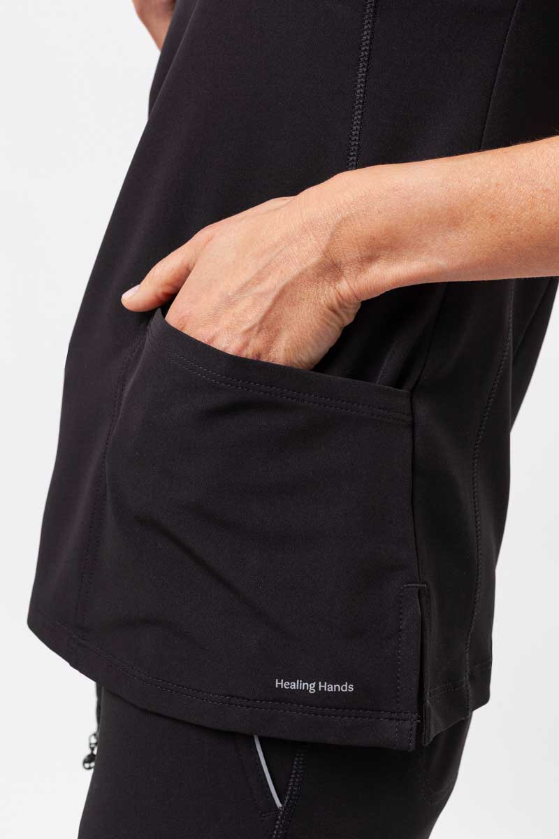 Halena Sonia zaujme už od výstřihu – asymetrický střih s jemným zipem dodává blůze osobitý charakter a moderní styl. Vypasovaný střih a tvarující švy jemně zvýrazňují postavu, zatímco boční rozparky dodávají lehkost. Měkká, čtyřsměrně elastická tkanina odvádí vlhkost, je odolná proti vyblednutí a zajišťuje plnou volnost pohybu. Tři praktické kapsy, z toho jedna s přihrádkou na propisku, spojují funkčnost s promyšleným designem. Jemné reflexní lemování a decentní logo na zipu dotvářejí celkový vzhled a dodávají blůze styl, který vynikne v každém pracovním prostředí.