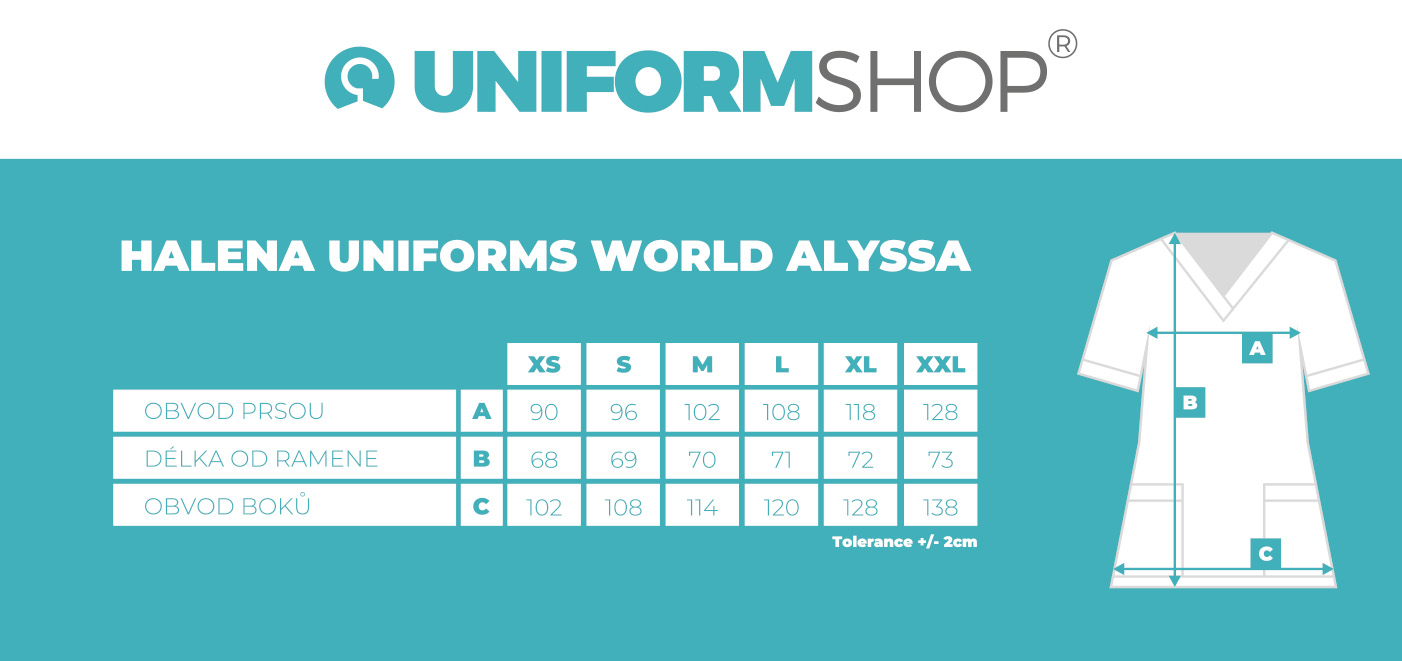 Hledáte halenu, která se dobře nosí a neomezuje v pohybu? Alyssa je kombinací pohodlí a elegance, která nevyžaduje žádné kompromisy. Výstřih do V a mírně přiléhavý střih dělají svou práci – bez zbytečné volnosti, ale také bez tlaku. Pružná, měkká tkanina zaručuje pohodlí při každém pohybu a boční zářezy dodávají volnost tam, kde ji nejvíce potřebujete. Tři spodní kapsy a poutko na identifikační kartu jsou praktickým doplňkem. Tento model je určen pro ty, kteří nechtějí volit mezi pohodlím a profesionálním vzhledem – protože jedno nevylučuje druhé.