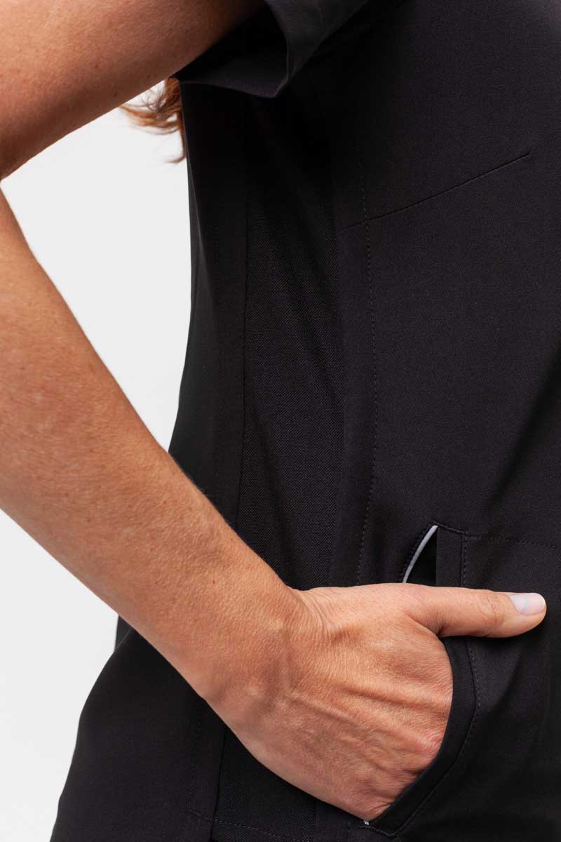 Moderní s retro nádechem – halenka Skyler spojuje sportovní ležérnost s ženským, elegantně propracovaným stylem. Jemné lemování u bočních kapes a decentní logo Healing Hands na rukávu dodávají modelu osobitý charakter, zatímco tvarující švy na zádech a boční rozparky zvýrazňují siluetu. Výstřih do tvaru písmene „V“ a lehce projmutý střih zajišťují elegantní vzhled, zatímco zaoblený spodní lem dodává celku jemnost a lehkost. Měkká, ve čtyřech směrech pružná tkanina odvádí vlhkost, nevybledne a poskytuje maximální pohodlí po celý den. Skyler je halenka, která sama definuje styl – ideální samostatně nebo v kompletu s kalhotami Nisha.