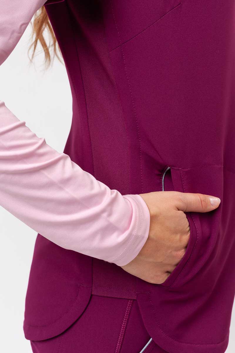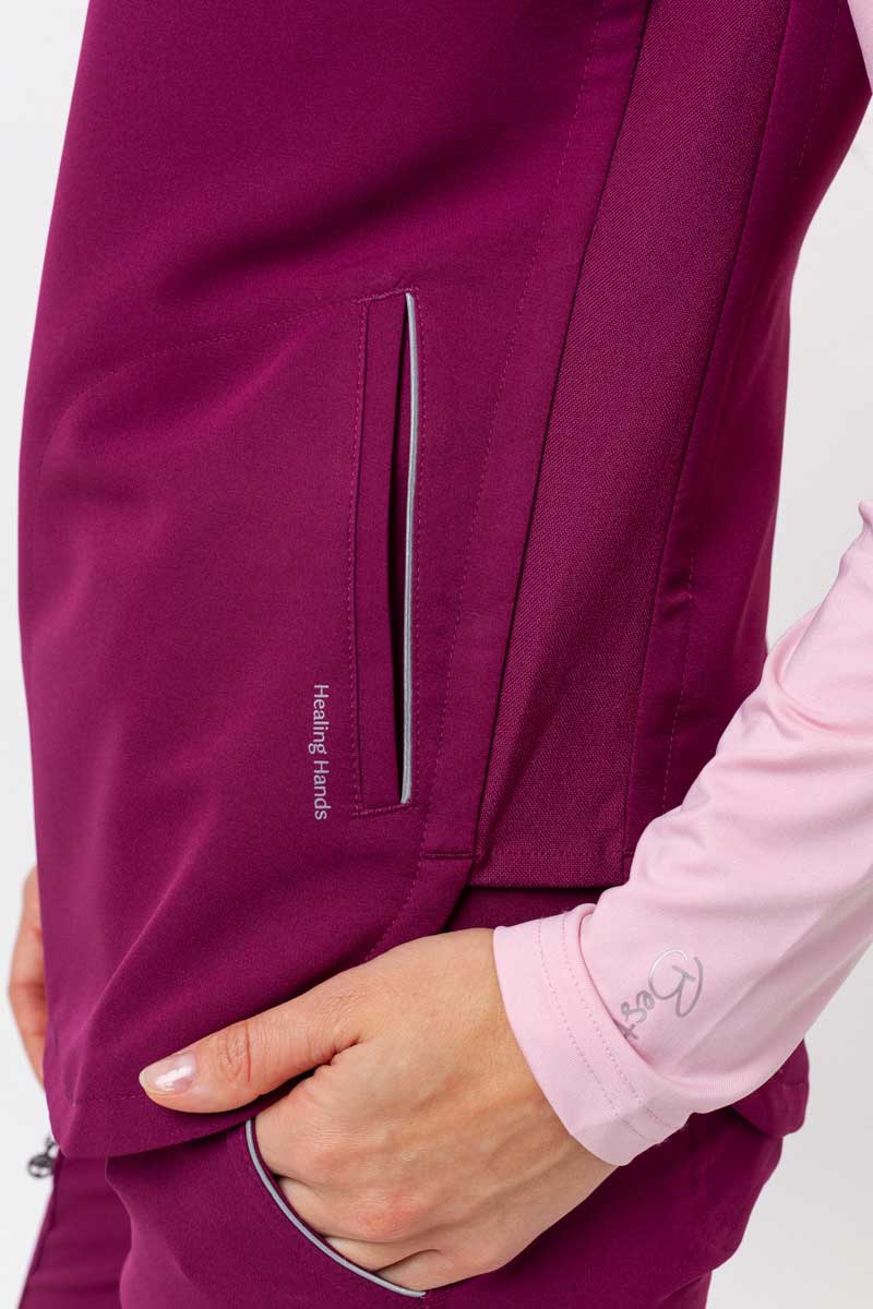 Moderní s retro nádechem – halenka Skyler spojuje sportovní ležérnost s ženským, elegantně propracovaným stylem. Jemné lemování u bočních kapes a decentní logo Healing Hands na rukávu dodávají modelu osobitý charakter, zatímco tvarující švy na zádech a boční rozparky zvýrazňují siluetu. Výstřih do tvaru písmene „V“ a lehce projmutý střih zajišťují elegantní vzhled, zatímco zaoblený spodní lem dodává celku jemnost a lehkost. Měkká, ve čtyřech směrech pružná tkanina odvádí vlhkost, nevybledne a poskytuje maximální pohodlí po celý den. Skyler je halenka, která sama definuje styl – ideální samostatně nebo v kompletu s kalhotami Nisha.
