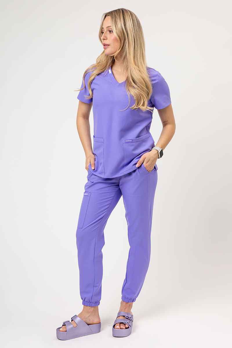 Tato souprava je skutečnou revolucí - halena a kalhoty, které nejen skvěle vypadají, ale jsou připraveny na nejdelší pracovní cykly! Halena je jako objetí, které vydrží celý den - vždyť kdo by nesnil o prodyšném, rychleschnoucím materiálu, který říká „sbohem záhyby a pachy“? Přiléhavý střih s výstřihem do V dodává haleně styl, zatímco rozšířený spodní lem s rozparky zajišťuje volný pohyb. Navíc prostorné kapsy a chytrý háček na doklady - protože jste nejen styloví, ale také organizovaní! A kalhoty? Ty jsou přímo kouzelné! Pohodlné, pružné, ve stylu jogger, který ti dodá uvolněný vzhled. Díky zúženým nohavicím a středně vysokému střihu budete nejen pohodlní, ale také budete vypadat módně. Tkanina se superschopnostmi: prodyšná, rychleschnoucí a samozřejmě s technologií PROTX2®, která chrání před zápachem. A široký elastický pas? Jako by byl vytvořen speciálně s ohledem na lékařské maratony.
