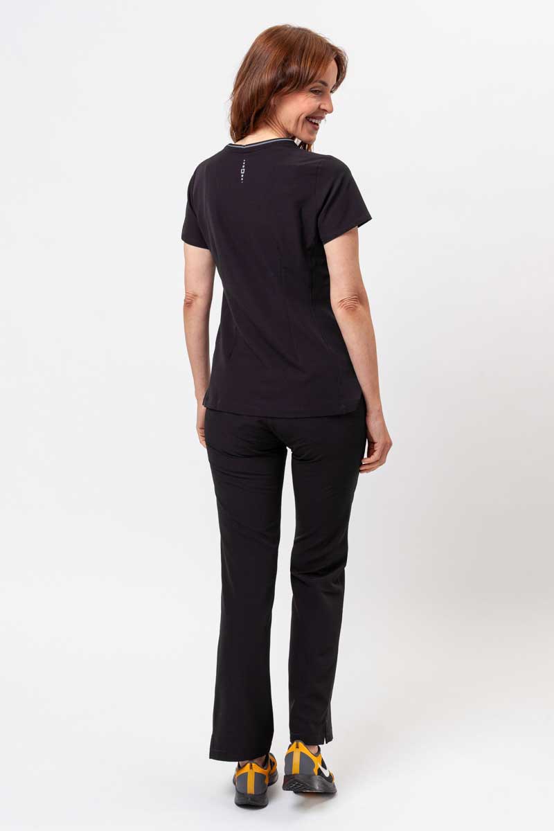 Lemování se jemně leskne při každém pohybu a přiléhavé siluety haleny i kalhot dodávají uniformě lehce sportovní, moderní charakter. Výstřih na zip, tvarující švy a jemné detaily na halence zvýrazňují postavu a dodávají jí sofistikovaný nádech, zatímco rovné kalhoty s reflexním lemováním u kapes a dvoubarevnou šňůrkou vytvářejí jednotnou, harmonickou linii. Pět praktických kapes pojme vše, co v práci potřebujete, a měkká, čtyřsměrně elastická tkanina odvádí vlhkost, zachovává barvu a poskytuje pohodlí po celý den. Tento komplet je spojením komfortu, funkčnosti a stylu – uniforma, která skutečně přitahuje pozornost.