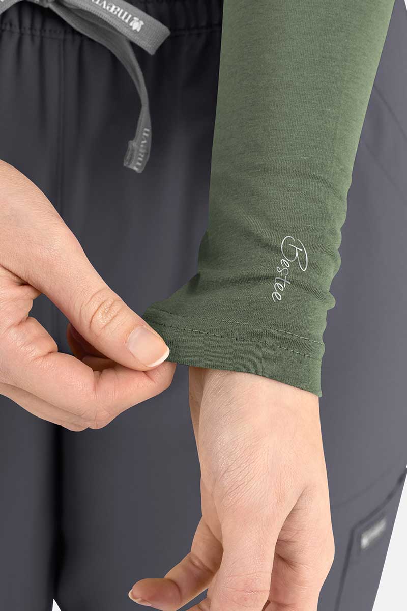 Konec šedi a jednotvárnosti, barevná trička Maevn Bestee přebírají vedení! Jsou k dostání v široké škále barev a jejich výhodou je, že vás dokážou nabít energií i v zamračených dnech. Kulatý výstřih s dlouhými rukávy a ozdobnou nálepkou na levém rameni se skvěle hodí pod zdravotní halenku nebo zástěru. Elastická tkanina z lycry vám nabízí hezký střih a jemný lesk. Intenzivní zelená, sytě červená nebo tlumená bílá? Vyberte si každý den barvu podle Vaší nálady.