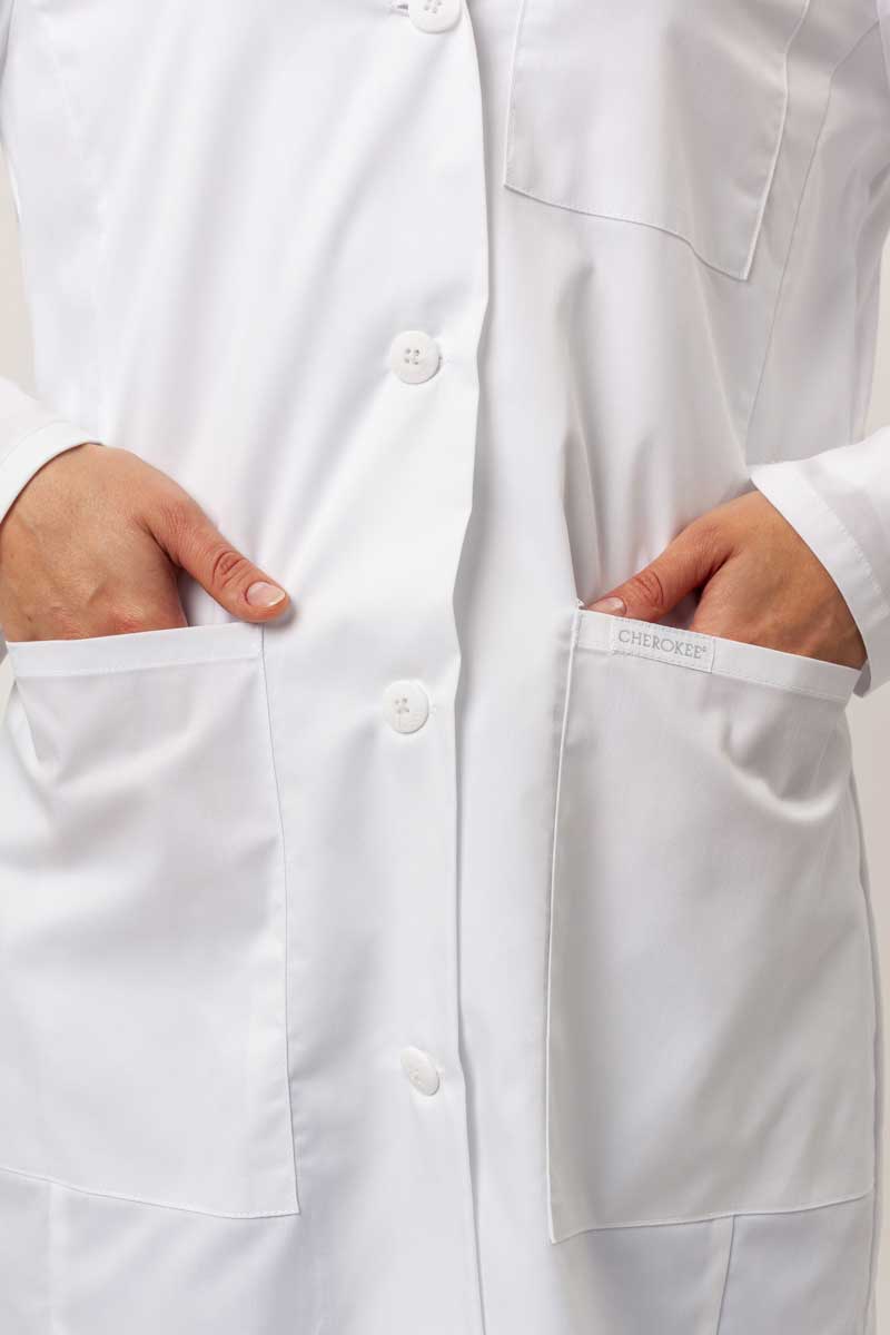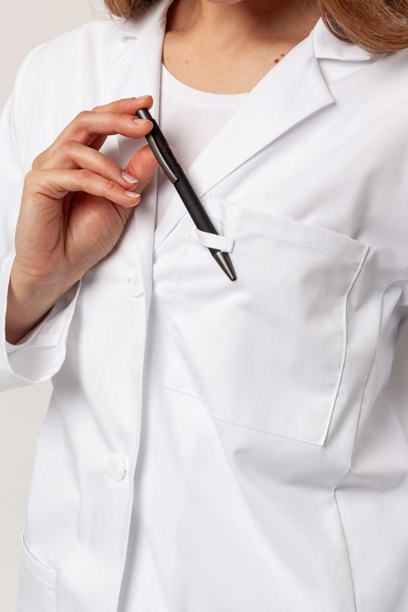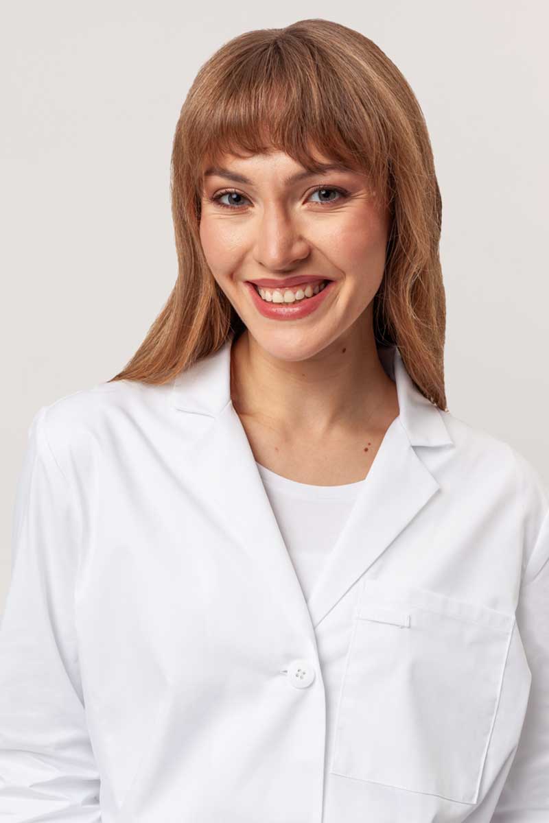 Výrazný střih, elegantní linie a praktické detaily – tento model z kolekce Project Lab ukazuje, jak spojit profesionální vzhled s moderním stylem. Čtyři knoflíky, klasický límeček a švy vpředu i vzadu vytvářejí elegantní siluetu, která zvýrazňuje postavu. Tři praktické kapsy – z toho jedna s poutkem na doplňky – zajišťují pohodlí při práci, zatímco lehce vypasovaný střih dodává plášti stylový i funkční vzhled. Dokonale bílá barva a vysoce kvalitní materiál podtrhují dojem profesionality v moderním pojetí.
