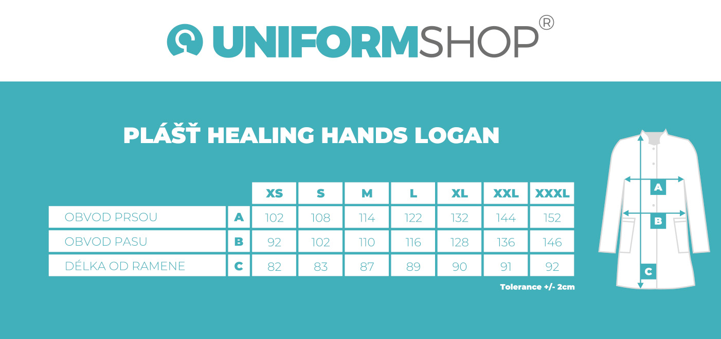 - Zapínání na tři pevné knoflíky, pečlivě dokončené jemným gravírováním loga "Healing Hands"
